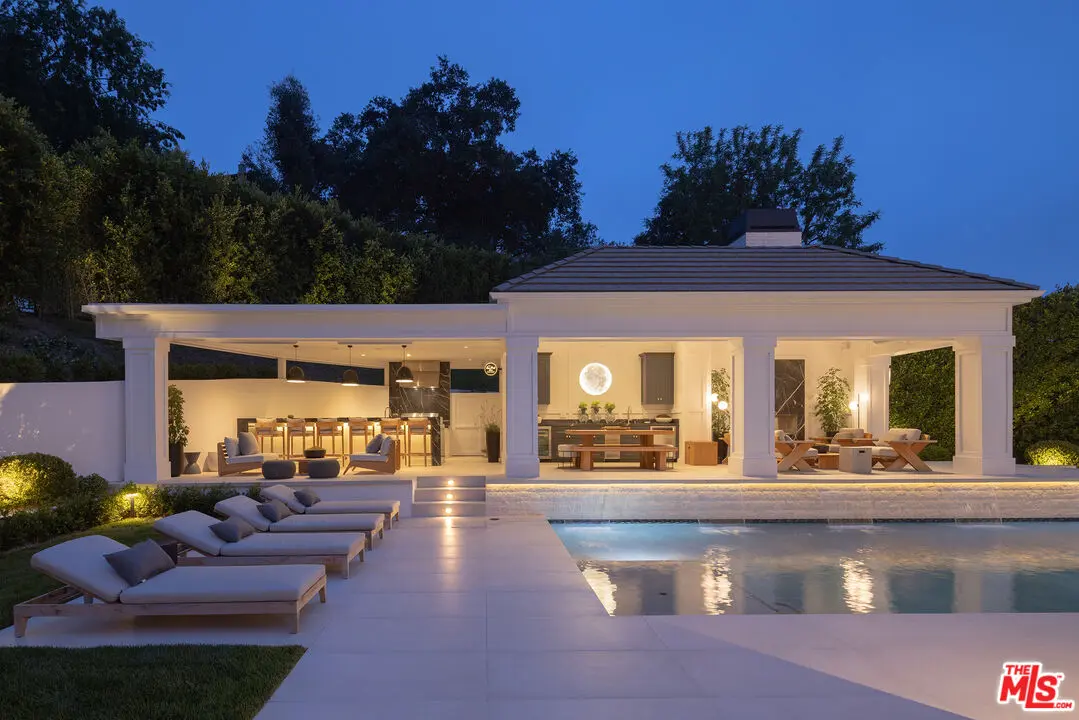 Positioned within the coveted Hidden Valley enclave of Beverly Hills, this impeccable estate offers privacy and tranquility behind secure gates, with 24/7 guard protection and lush, mature landscaping. Situated in one of the area’s most prestigious guard-gated communities, this residence showcases timeless design, grand proportions, and a thoughtfully updated aesthetic that harmonizes with its natural surroundings. Every element of this home has been masterfully conceived to deliver an unparalleled living experience. A dramatic 24-foot ceiling in the entry foyer sets the tone, featuring custom-crafted millwork and elegant wrought-iron accents that echo throughout the interiors. Spanning approximately 12,000 square feet, the residence is graced with wide-plank white oak floors, 12-foot-high ceilings, and windows that frame serene canyon vistas. The main level unfolds with a series of distinguished spaces, including a formal living room, office, formal dining room, and multiple powder rooms. A spacious family room seamlessly connects to the outdoor entertaining areas, where a sprawling backyard oasis includes a pool, spa, outdoor kitchen, bar, dining pavilion, and fire pit lounge for sunset perfect picnics.