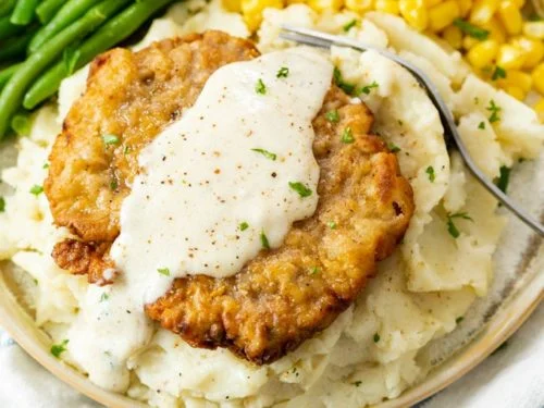 Make the White Gravy: * Once all the steaks are fried, carefully pour off most of the frying oil from the skillet, leaving about ¼ cup of the pan drippings and any browned bits (fond) in the pan. If you don’t have enough drippings, add butter or more cooking oil to reach ¼ cup. * Return the skillet to medium heat. Sprinkle the reserved 2 tablespoons of seasoned flour (or fresh all-purpose flour if you didn’t reserve it) into the hot drippings. * Whisk constantly for 1-2 minutes, scraping up any browned bits from the bottom of the pan, until the flour and fat form a smooth roux and it starts to smell nutty (but don’t let it get too brown if you want a true white gravy). * Gradually whisk in the whole milk, about ½ cup at a time, whisking vigorously after each addition to prevent lumps. Continue whisking until all the milk is incorporated and the gravy is smooth. * Bring the gravy to a simmer, whisking frequently. Cook for 3-5 minutes, or until the gravy thickens to your desired consistency. It should be thick enough to coat the back of a spoon. * Taste the gravy and season with additional salt and plenty of freshly ground black pepper. Add a pinch of cayenne pepper if desired for a little warmth.