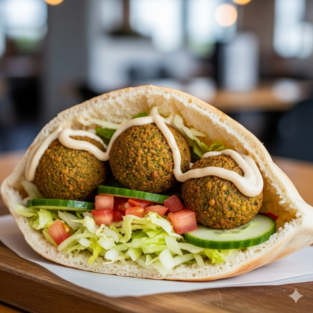 Super yummy this recipe is for a classic falafel pita sandwich, featuring crispy falafel balls, fresh vegetables, and a creamy tahini sauce.
